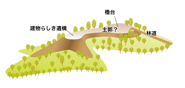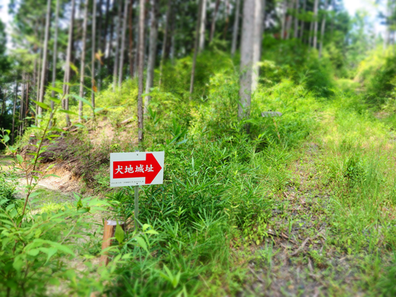 現地案内板によると現地付近の林道建設時に一段下の平坦な場所に住居らしい遺構が発見されたとされております。現地の有志の方々に木々も伐採されて、管理されております。遺構は、櫓台があったと思われる曲輪と建物があったと思われる曲輪があり、細長く簡素な城砦です。遠藤胤直も関ヶ原の戦いでは、犬地城に籠らず、少し離れた上ヶ根(じょうがね)に砦を築いて戦ったので、戦闘に不向きな城だったかもしれません。城山は山腹に「犬地城址」の目立つ看板が設置されており場所は確認しやすいです。林道が設置されており、城の主郭まで行けるのが有難いが、藤井霊園という墓地まで車で乗り入れて駐車して、その後は、歩いて行くのをおすすめします。